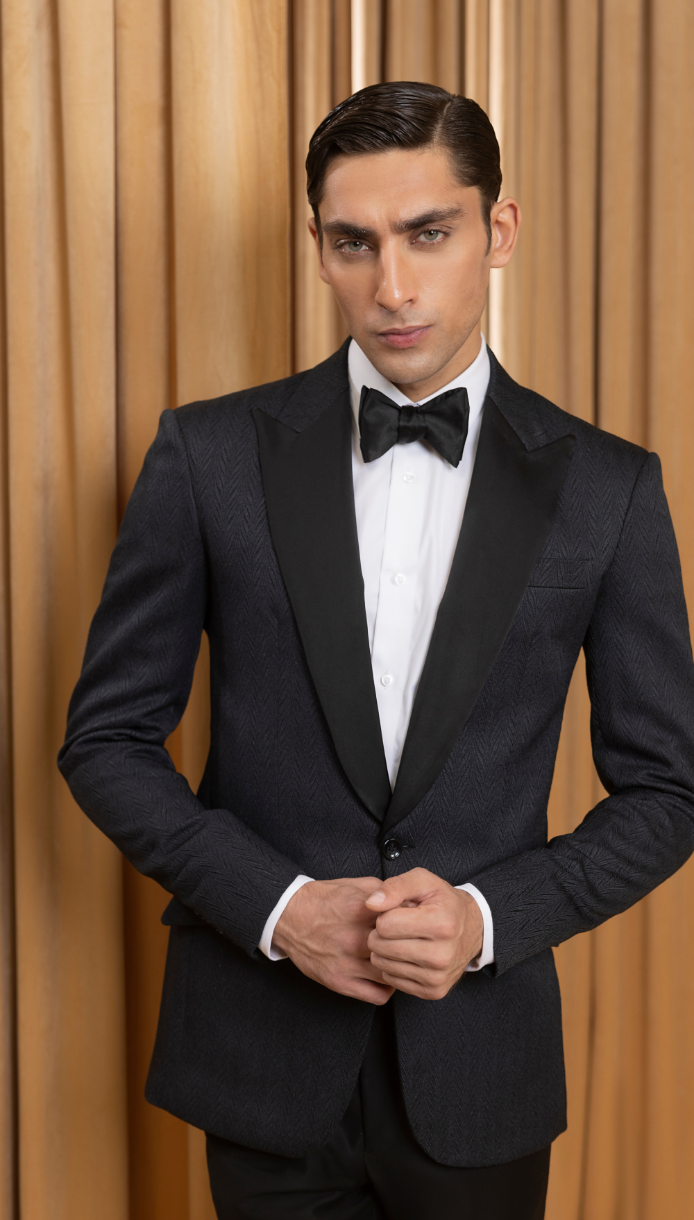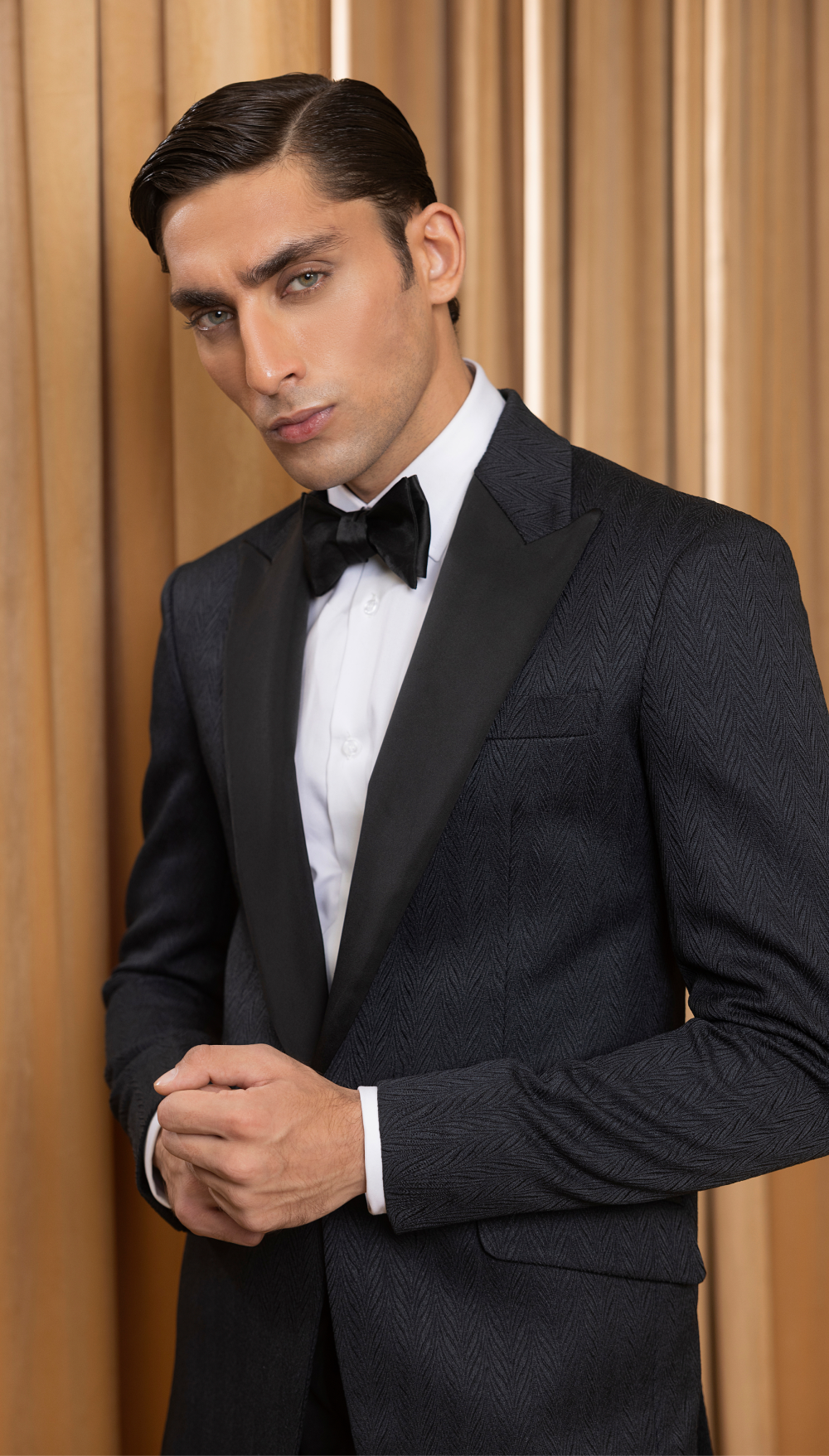Stand out at your next formal event with our embossed tuxedo featuring satin lapels. This stunning tuxedo combines intricate embossed detailing with a timeless silhouette, perfect for weddings or upscale events.