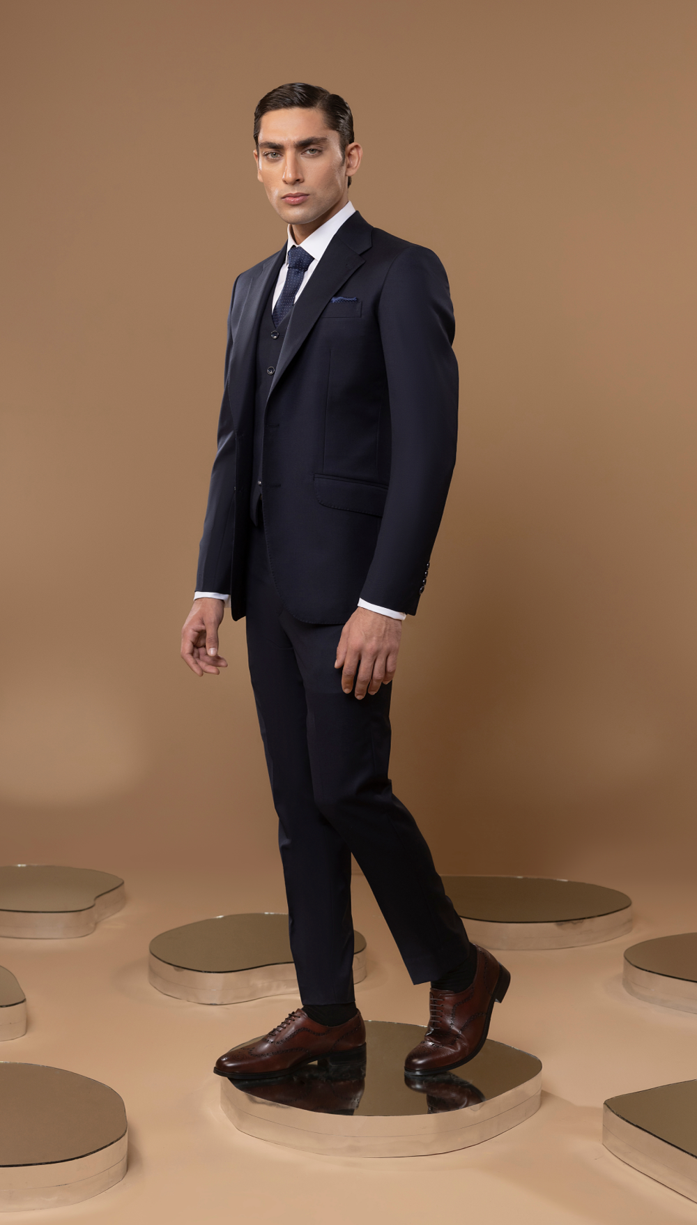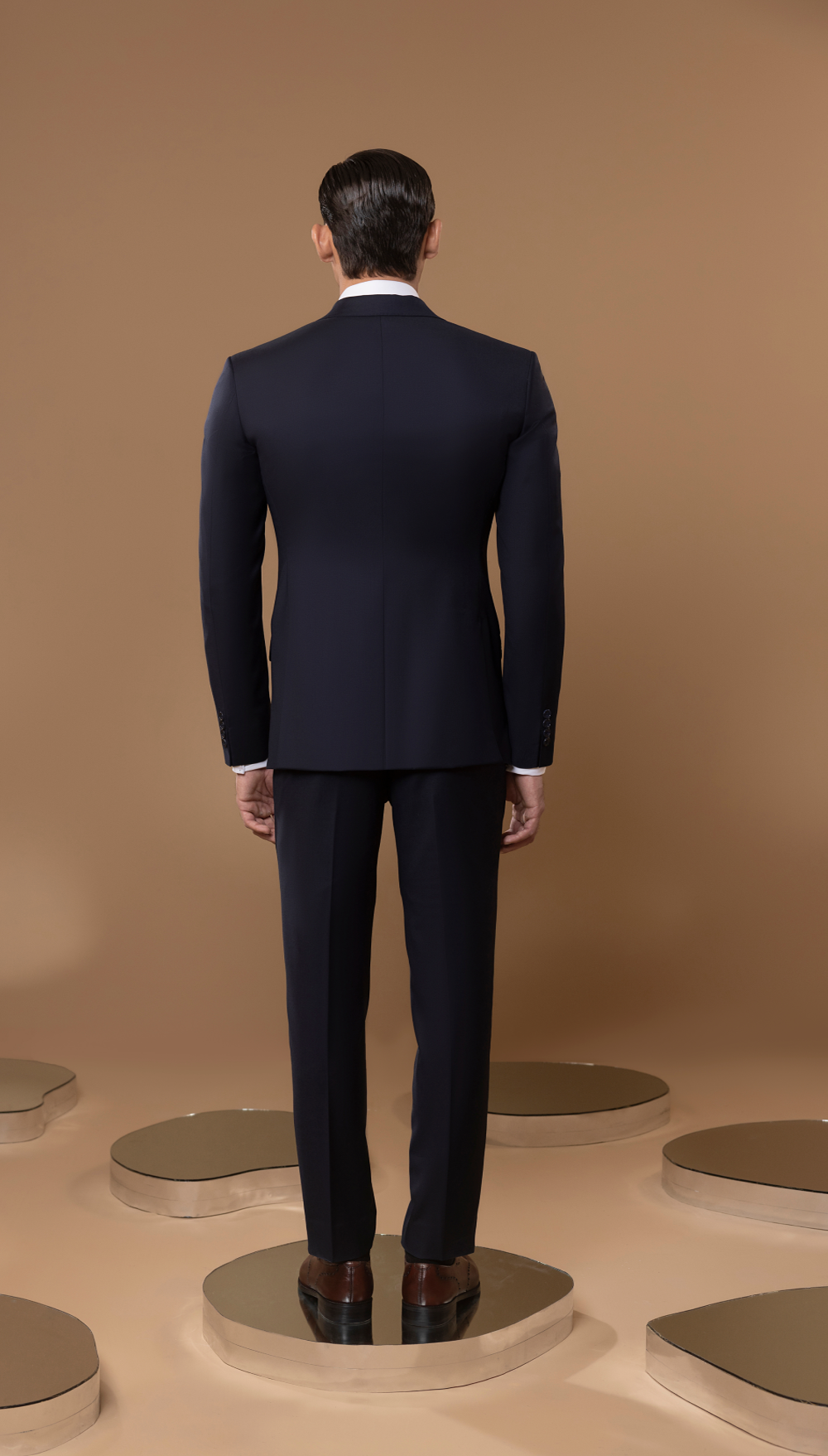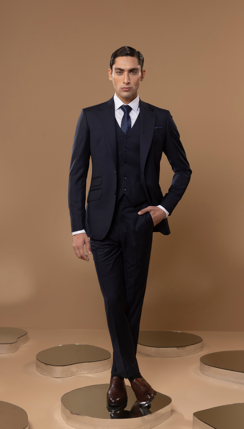 This 3-piece navy wool suit is a staple for any wardrobe, offering a timeless charm and versatile style. Perfect for business meetings, formal occasions, or evening events, this suit provides a sharp and polished look.