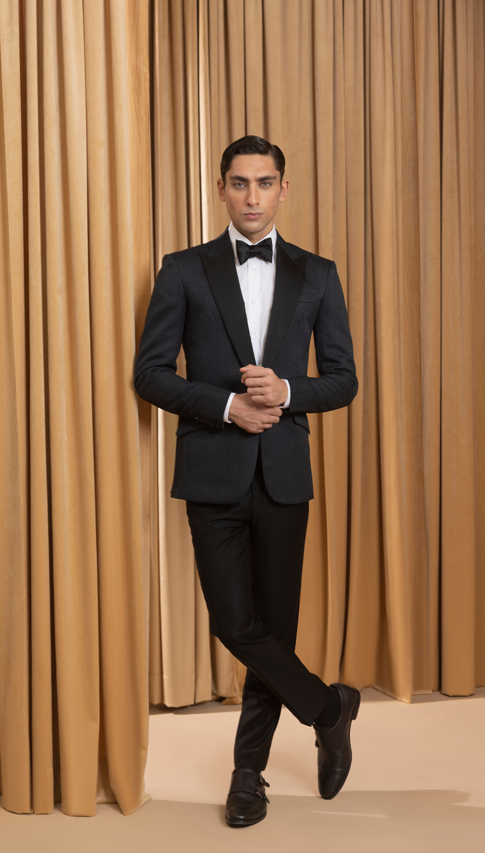 Stand out at your next formal event with our embossed tuxedo featuring satin lapels. This stunning tuxedo combines intricate embossed detailing with a timeless silhouette, perfect for weddings or upscale events.