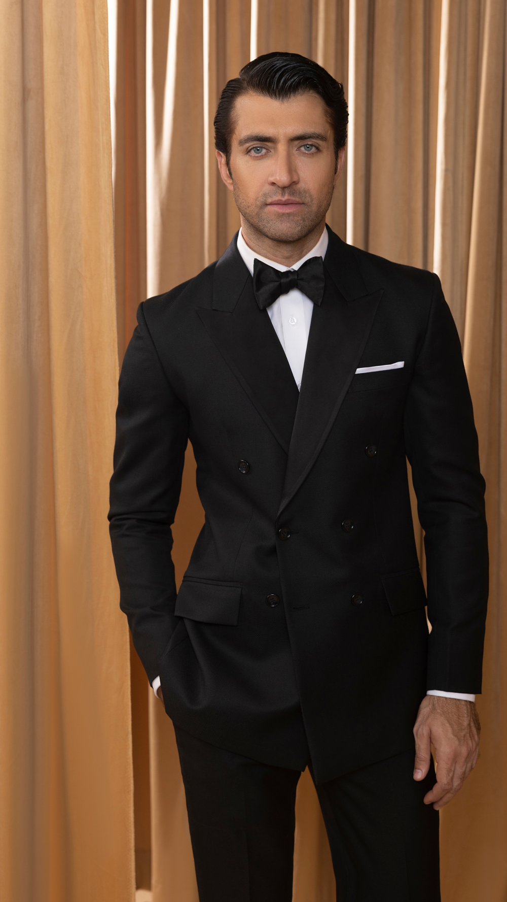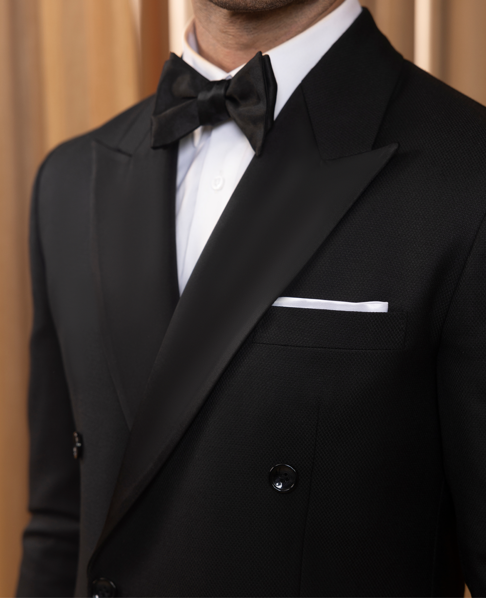 Elevate your formal wardrobe with our textured black double breasted jacket featuring satin lapels. This striking jacket is perfect for black-tie events, weddings or sophisticated evenings out, combining a luxurious texture with a classic silhouette.