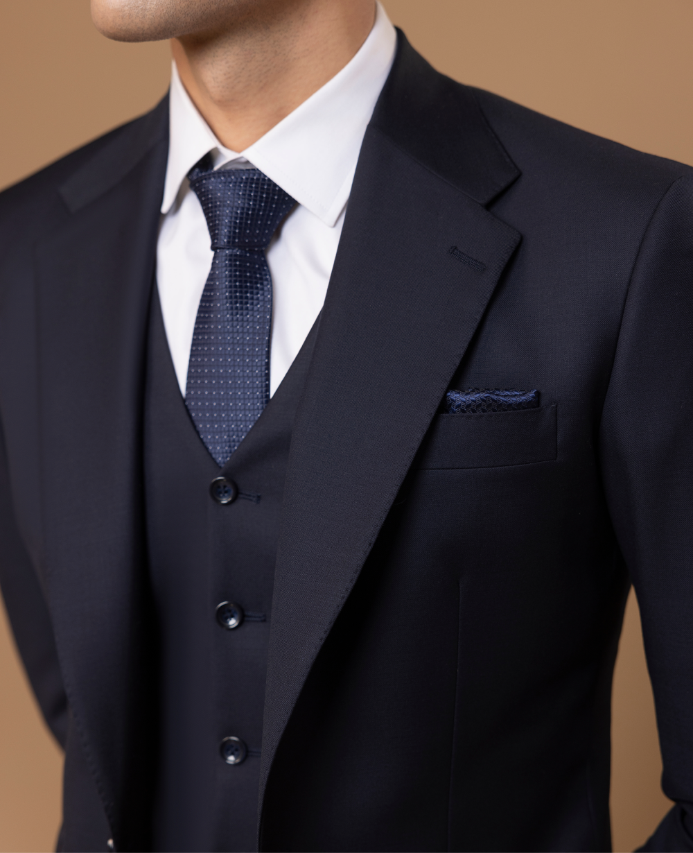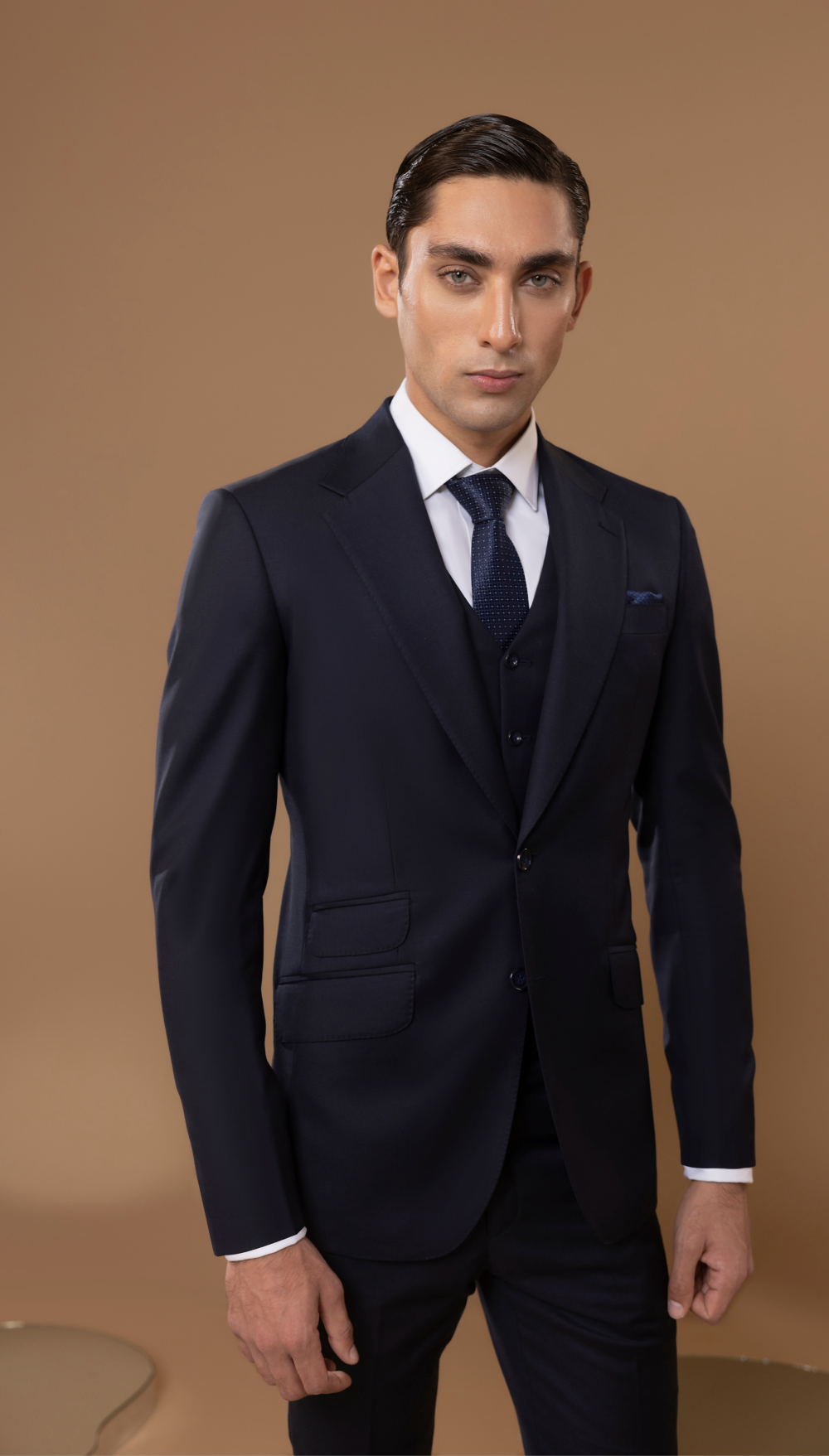 This 3-piece navy wool suit is a staple for any wardrobe, offering a timeless charm and versatile style. Perfect for business meetings, formal occasions, or evening events, this suit provides a sharp and polished look.